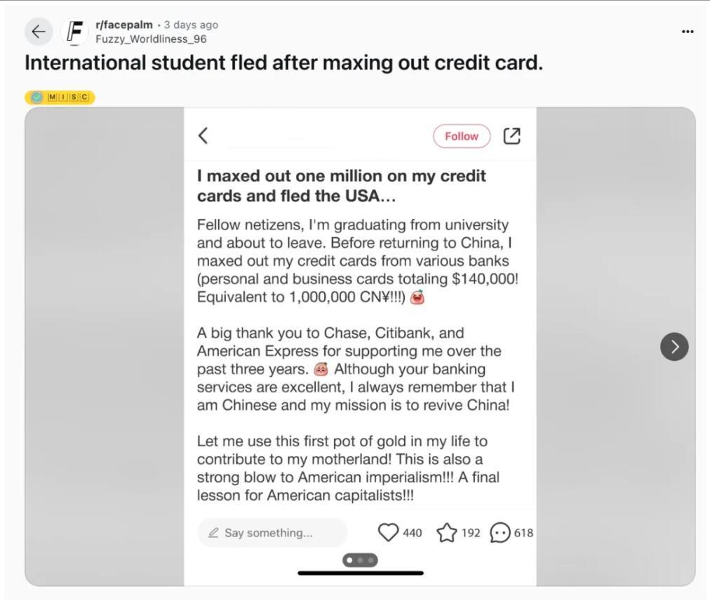 炸锅!中国留学生在美刷爆100万信用卡后逃回国!如今回旋镖来了
