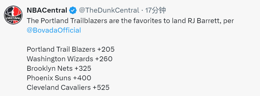 巴雷特的最新下家赔率也已经出炉,太阳+400排在第四位,前三位是开拓者、奇才、篮网。骑士排在第五位。目前巴雷特有可能被猛龙交易,他们依然想以巴恩斯为核心建队。寻找像杜兰特这样的球星来搭档巴恩斯,效仿当年引进小卡夺冠的模式,是猛龙当前的想法。