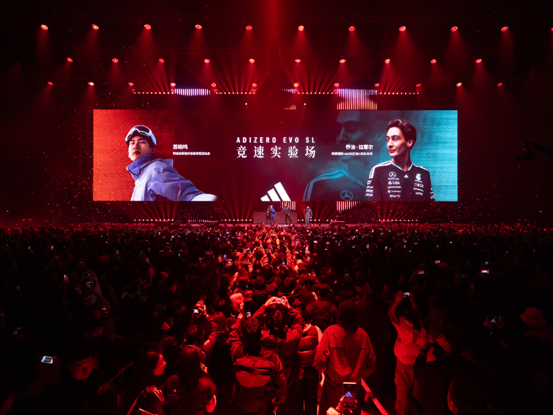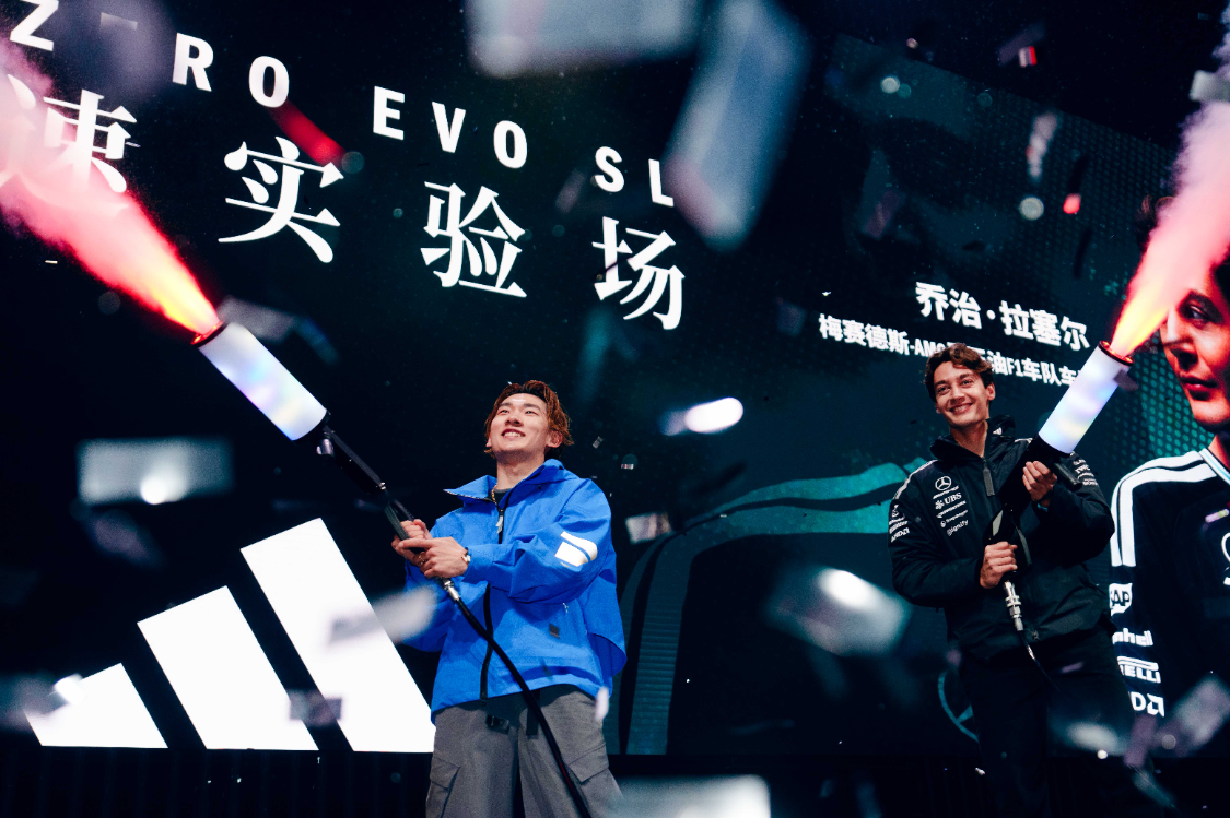 乔治·拉塞尔与苏翊鸣破圈联动,联袂登场。拉塞尔驾驶AMG跑车以标志性“甜甜圈”漂移震撼开场,用引擎转速与轰鸣点燃全场脉搏;随后二人于舞台上围绕“速度”主题展开互动,以趣味横生的问答加深彼此交流,跨界演绎“只有adidas才能拉起的速度”,宣告竞速实验正式开启。